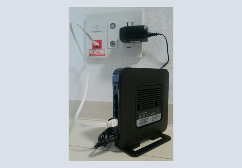 1、以下の写真のようにLANケーブルをルーター本体【INTERNET(青)】から壁面接続部へ、電源アダプターをコンセントへ接続してください。